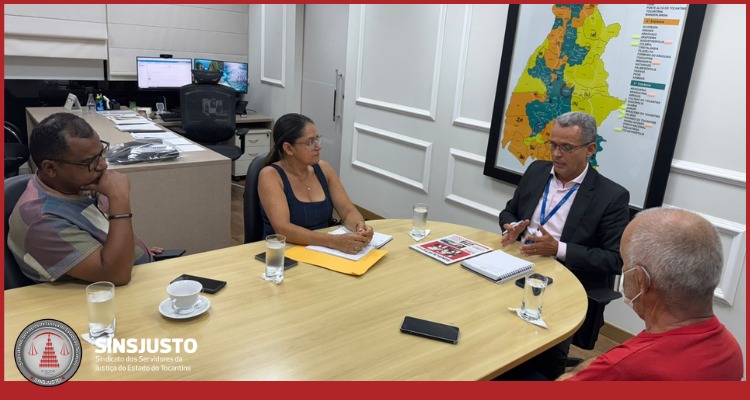 A Diretoria do Sindicato dos Servidores da Justiça do Estado do Tocantins (Sinsjusto) se reuniu na tarde desta sexta-feira, 30, com o Diretor-Geral do Tribunal de Justiça do Tocantins (TJTO), Francisco Cardoso, o "Tchesco", para tratar de demandas de interesse da categoria que estão em andamento ou em fase de estudo.